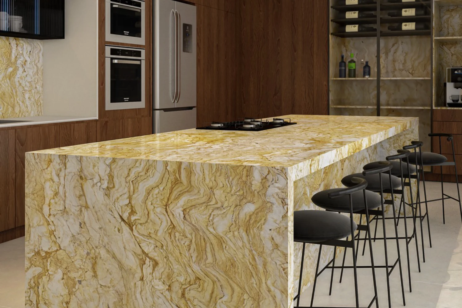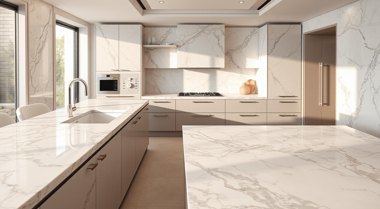 Superfície moderna, versátil e altamente resistente, ideal para bancadas e áreas de grande uso.